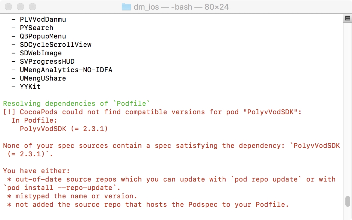 时,会默认先更新一次 Podspec 索引。如果更新太慢,可修改 repo 地址为国内的镜像,如 gitcafe 的镜像操作命令如下: