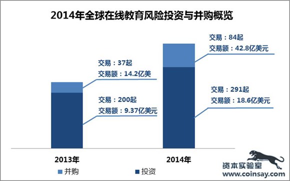 全球在线教育风险投资交易额18.6亿美元,较上年度增长近一倍;并购交易额42.8亿美元,较上年度增长两倍。