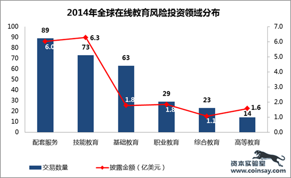 2014年全球在线教育行业投资事件中,IT/配套服务领域投资事件89起,占比30.6%,交易额6亿美元,占比32.4%;技能教育投资事件73起,交易额6.3亿美元;基础教育投资事件63起,交易额1.8亿美元。