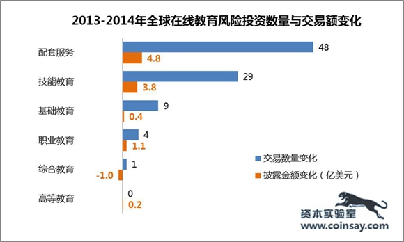 与2013年相比,本年度教育配套服务和技能教育在投资数量、投资金额方面的增长都非常明显;基础教育、职业教育领域小幅增长;综合教育、高等教育领域的投资增长相对缓慢。
