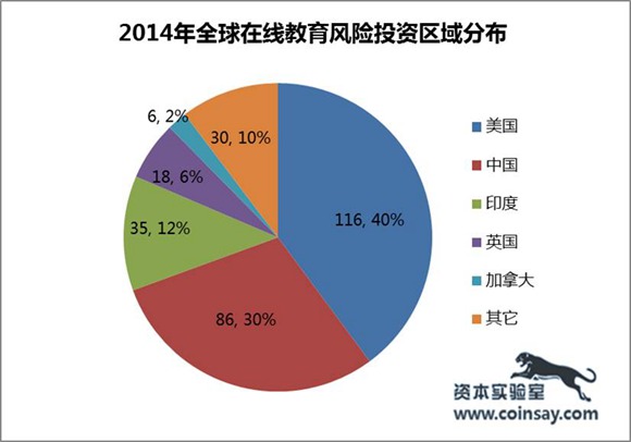 2014年在线教育行业风险投资覆盖全球23个国家和地区。其中,美国市场投资交易116起,占总交易数量的40%;披露交易额10亿美元,占总交易额的54%。其余交易分别来自:中国86起,交易额4.8亿美元;印度35起,交易额4249万美元;英国18起,交易额6131万美元。