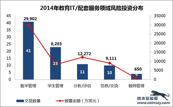 2014年获投资的IT/配套服务企业以教学管理业务为主,包括在线教育平台搭建、教学设备等教育资源管理等, 投资事件41起,交易额达到3亿美元;针对学生的学习管理与服务平台投资事件23起,交易额达到8283万美元;而学生教育数据与信息,以及学习效果评估领域的投资事件11起,交易额达到1.2亿美元;学生、家长、教师的信息交流平台以及教师管理平台也都吸引了一定的风险资本进入。
