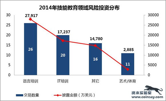 在技能教育领域,语言培训最受创业者和投资机构关注;其次是以编程学习为主的IT培训;音乐、艺术、体育为主的文体类教育培训机构获得少量投资。