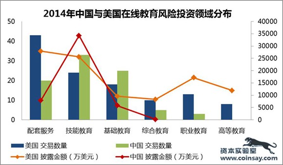 3. 教育配套、基础教育、技能教育三个领域是风险资本的投资重点。值得关注的是:整个行业的投资开始向上游延伸,为在线教育提供配套服务的技术型企业引资能力显著增强。美国市场是该领域发展水平最高的区域,中国市场在这方面差距较大。